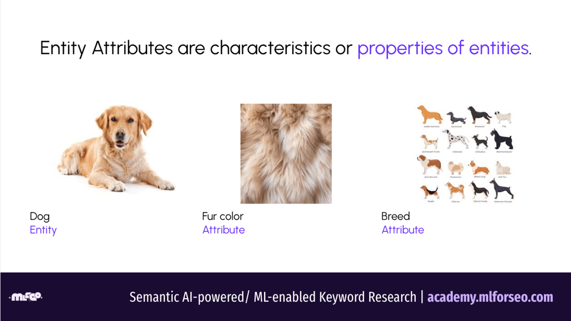 - Attribute: A property of that entity (e.g., food type, breed, location, niche, marital status).