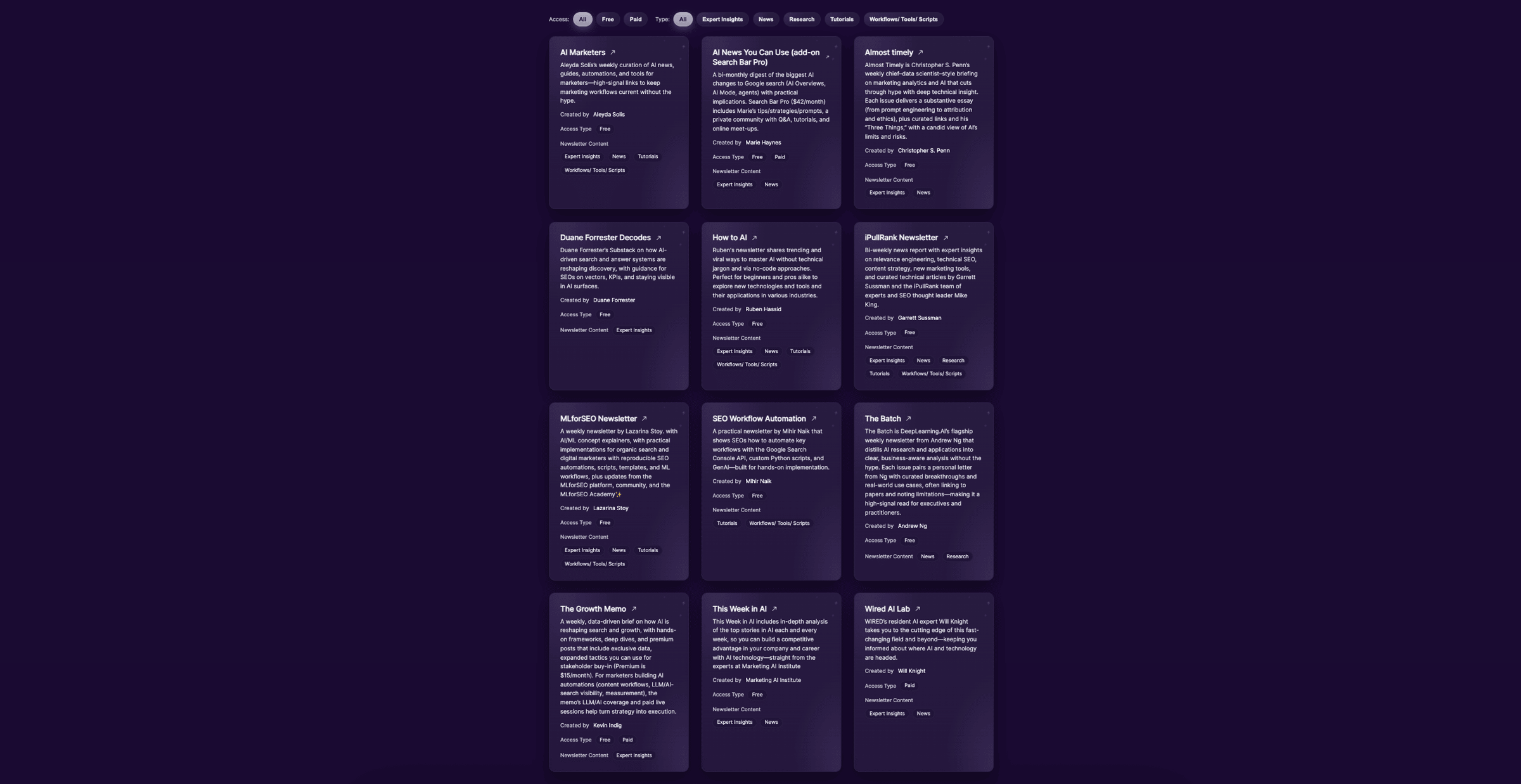 We have started building a complete list of all AI/ML-focused newsletters for digital marketing and organic search experts, heavily invested in AI/ML. We hope this lists helps individuals discover resources to learn from on topics like AI/ML, automations, workflows, scripts, tools, news, research and more.